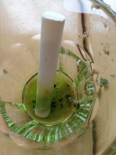 Zunächst zerkleinerten wir die Blätter mit den Händen, die Kinder, die die Brennnesseln zerrissen, durften Gummihandschuhe anziehen. Anschließend zerrieben wir die grünen Blätter zusammen mit etwas Sand und Brennspiritus in der Schale mit einem Mörser. Das Gemisch gaben wir in die Filtertüte, so dass nur die grüne Flüssigkeit im Glas landete. Nun stellten wir ein Stück weiße Kreide in das Glas und warteten. Nach einiger Zeit sah man auf der Kreide nicht nur die grüne Farbe, sondern auch gelb und braun, obwohl wir nur grüne
